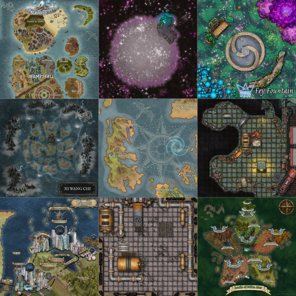 São 80 mapas construídos com material original do Inkarnate e outros softwares pagos e  a imagem é totalmente autoral, sem cópias de mapas da Internet.