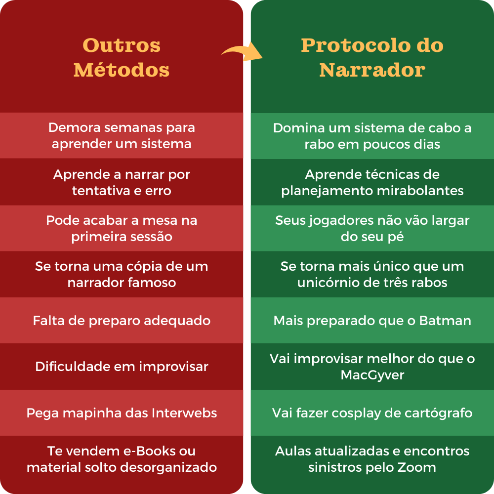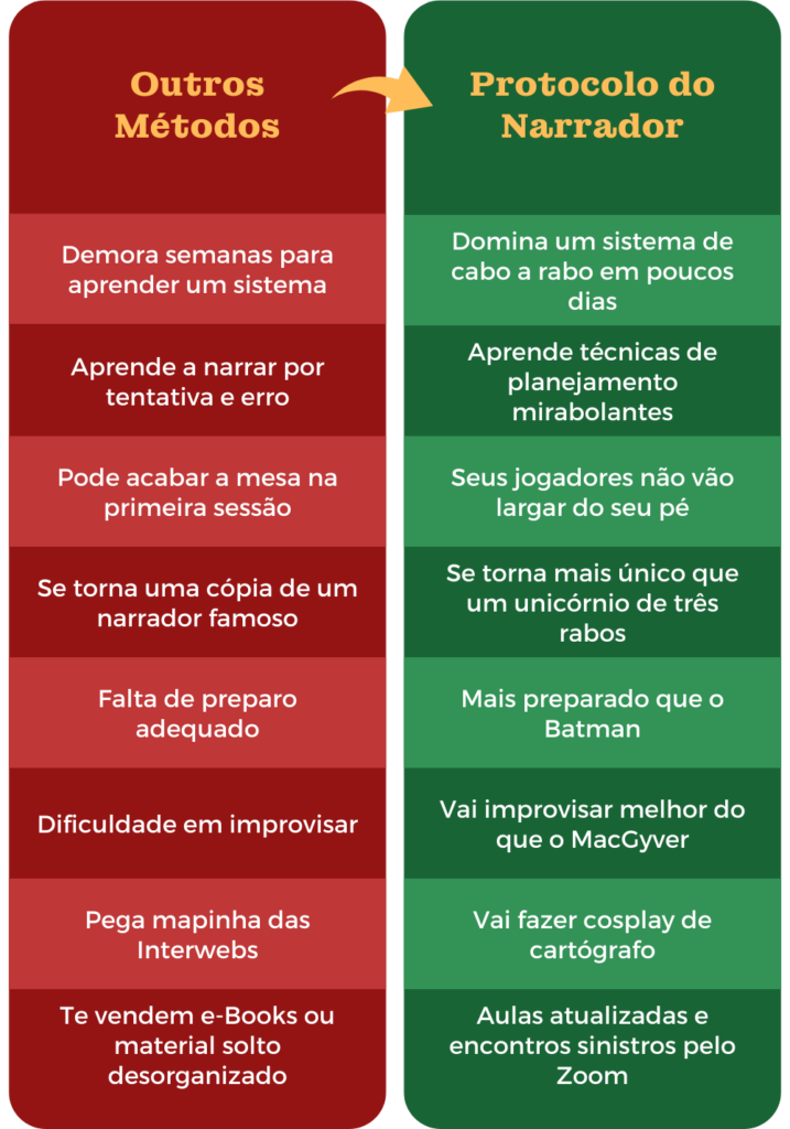 A premissa do curso é te deixar preparado e confiante para a sua mesa, vou sim ensinar idéias de como burlar a vergonha na hora de narrar e incentivar você no seu processo.